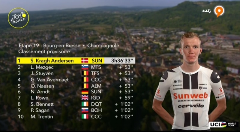 سورن کراگ اندرسن از دانمارک و تیم سان وب به مقام نخست مرحله نوزدهم توردوچرخه سواری فرانسه دست یافت . تا پایان مرحله نوزدهم تور دوچرخه سواری فرانسه ، پریموژ روگلیچ از اسلوونی همچنان پیشتاز است .