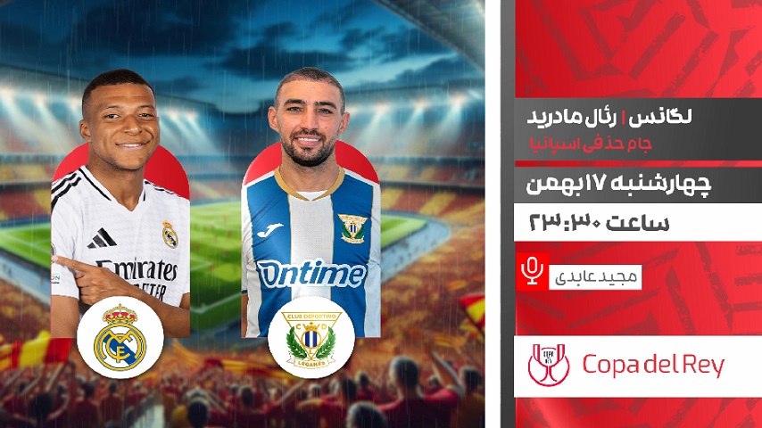 پخش زنده فوتبال جام حذفی اسپانیا : لگانس - رئال مادرید ، چهارشنبه 17 بهمن ساعت 23:30 از شبکه ورزش سیما چهار شنبه 10 بهمن 1403 ادامه...