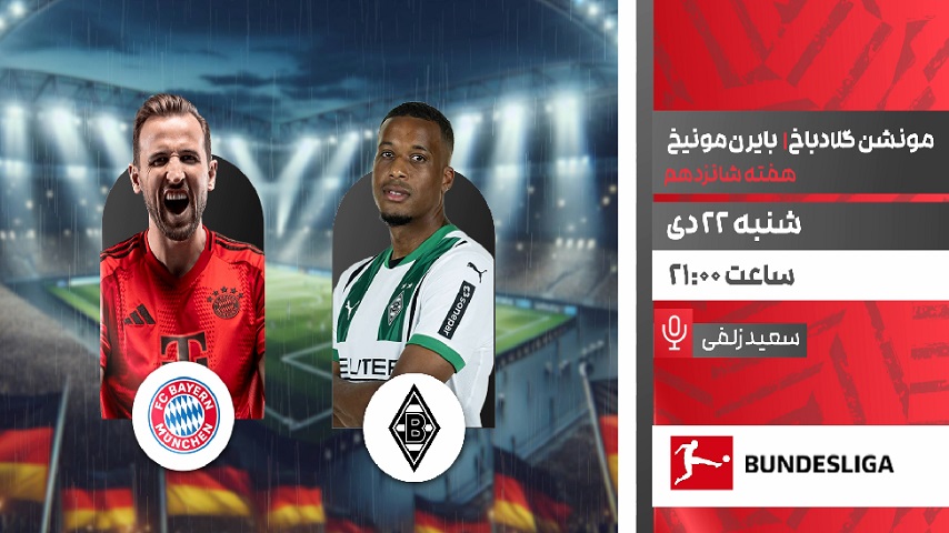 پخش زنده فوتبال بوندس لیگا آلمان : مونشن گلادباخ - بایرن مونیخ ، شنبه 22 دی ساعت 21 از شبکه ورزش سیما پنج شنبه 20 دی 1403 ادامه...